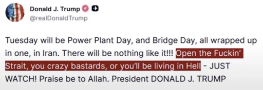 arrow-up10arrow-down1external-linkTrump tells Iran ‘open the F—in’ Strait, you crazy b——ds,’ — as he warns of new strikes and says ‘praise Allah’plus-squarenypost.comms.lane@lemmy.world to World News@lemmy.worldEnglish · 3 hours agomessage-square9linkfedilink