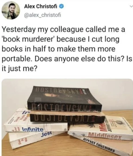 I know a woman that cut her textbooks in college to make them less heavy to carry. She is unique.