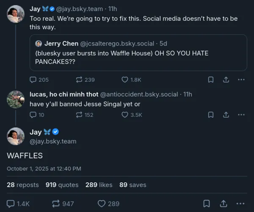 @jcsalterego.bsky.social on Bluesky: "(bluesky user bursts into Waffle House) OH SO YOU HATE PANCAKES??" @jay.bsky.team quotes posts this with: "Too real. We're going to try to fix this. Social media doesn't have to be this way." @antioccident.bsky.social replies to jay asking "have y'all banned Jesse Singal yet or" and Jay responds with "WAFFLES"