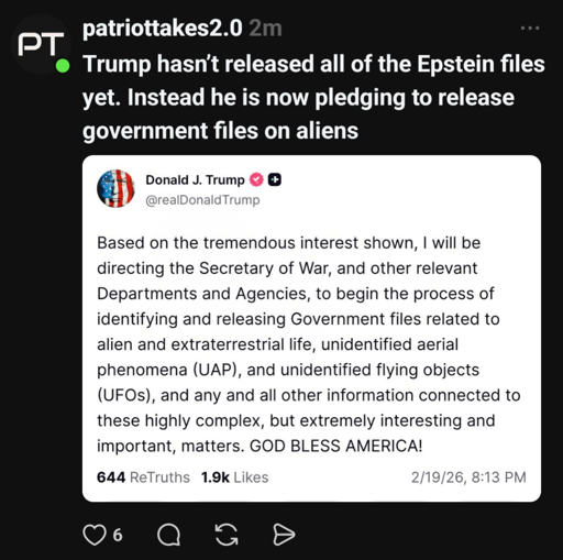 arrow-up11arrow-down1imageThis MF is quadrupling down and dropping Alien files before dropping the full, unredacted Epstein Files. GODDAMN.lemmy.worldFoxtrotDeltaTango@sh.itjust.works to Political Memes@lemmy.world · 1 month agomessage-square2linkfedilinkfile-text