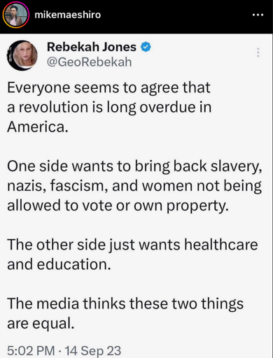 One side wants to break up families, abolish free speech, trans kids and make everyone attention slaves to big companies. The other side just wants freedom and happiness