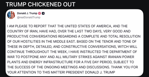 WanderWisley@lemmy.world to Political Memes@lemmy.world · 1 day agoTACO!lemmy.worldimagemessage-square16linkfedilinkarrow-up1191arrow-down11