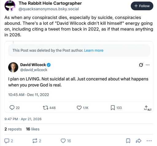 XaTuring@lemmy.world to Microblog Memes@lemmy.worldEnglish · edit-223 hours agoUpon contact with the unknown, David Wilcock shot himself in the head. Turns out he couldn't handle aliens encroaching on his lawn. I used to watch this guy on YouTube, before I stopped masturbating.plus-squarelemmy.worldimagemessage-square1linkfedilinkarrow-up11arrow-down10